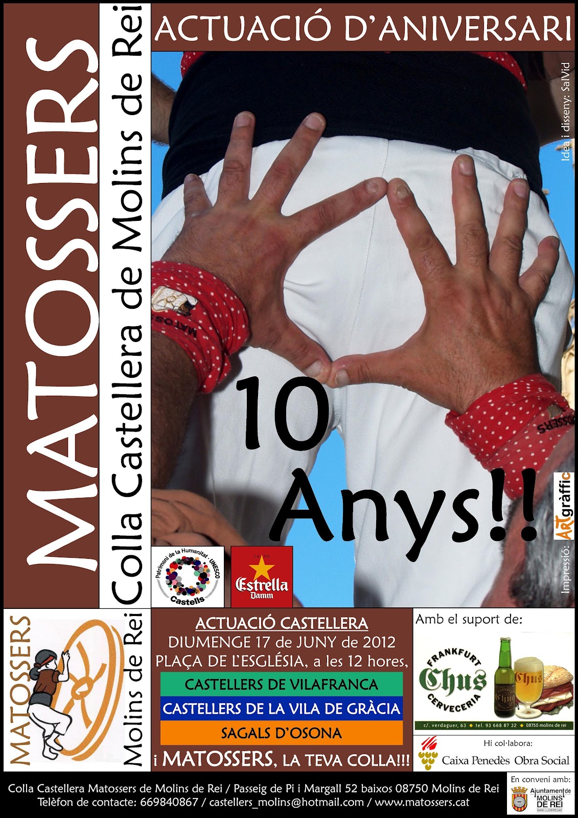 El proper diumenge 17 de juny la Colla Castellera del Matossers de Molins de Rei, celebren el seu desè aniversari amb una actuació a les 12h a la plaça de l’Esglèsia de Molins de Rei. Els acompanyaran els Castellers de Vilafranca, els Castellers de la Vila de Gràcia i els Sagals d’Osona.